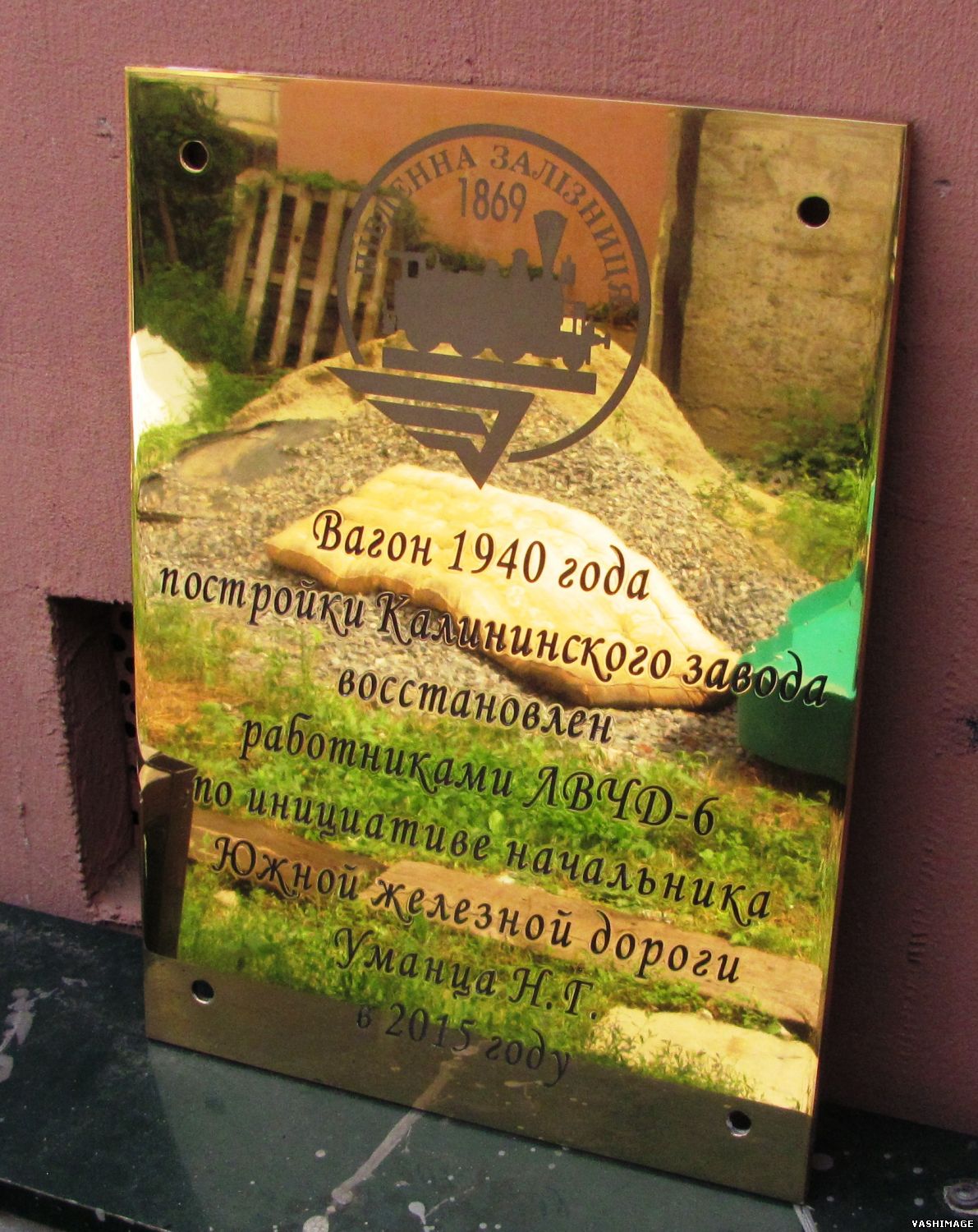 Памятная табличка из полированной латуни 4мм с глубокой фрезеровкой и матированным логотипом (пескоструй) для ЮЖД