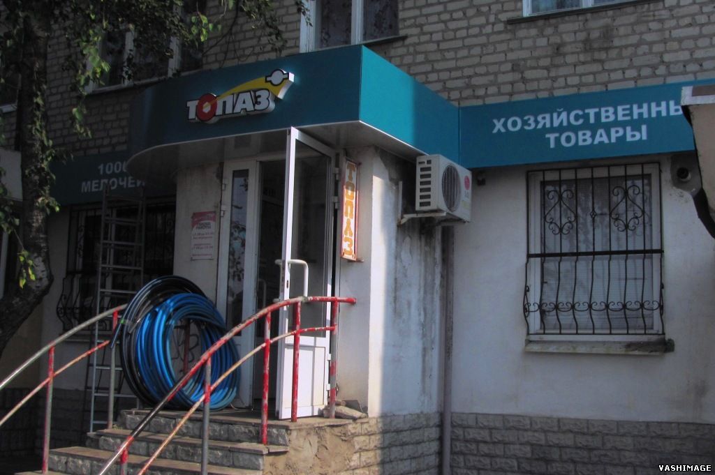 Выполнены работы в Харьковской области по обустройству и оформлению фасада хозяйственного магазина 1000 мелочей "ТОПАЗ": изготовлен выносной козырёк; фриз декоративный с криволинейной поверхностью облицован алюминиевым композитом со световыми акриловыми буквами и изготовлена фигурная светодиодная вывеска