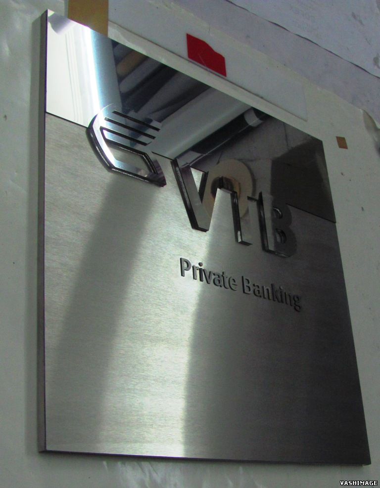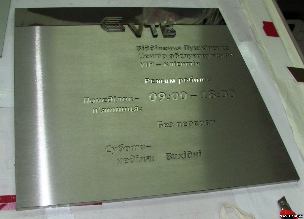 Изготовлен комплект (4шт) фасадных табличек из нескольких видов нержавеющей стали и с использованием различных техник: инкрустация; склейка органического стекла и металла; лазерная резка и фаска 90 градусов