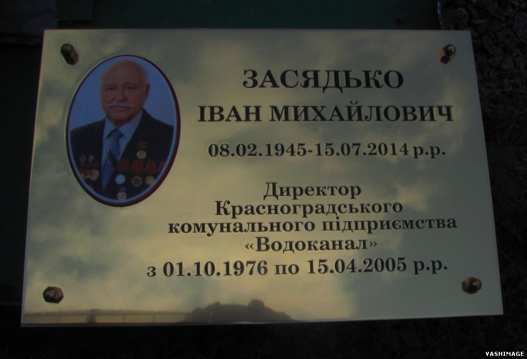 Металлическая (латунная) мемориальная табличка с инкрустацией объёмного цветного фото: латунь 4мм; полировка; фрезерованный текст с заливкой чёрной эмали для КП Красноградский водоканал